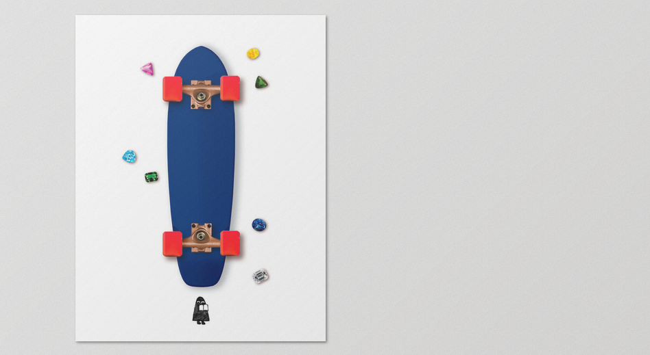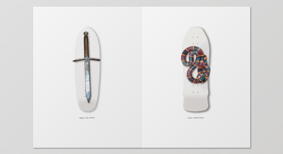 A Curious Catalogue is a skateboard product catalogue of pencil drawn anti-graphics, spin-art wheels, and slalom gemstones. It was designed to take a romantic and fantastic vision of a skateboard company and make it ‘real’. Michael Leon was inspired by the naïve wonder he experienced as a young skateboarder, which he juxtaposes with an elegant, yet dry, catalogue sales format. The result is a carefree and poetic narrative carried by a range of imagined products.