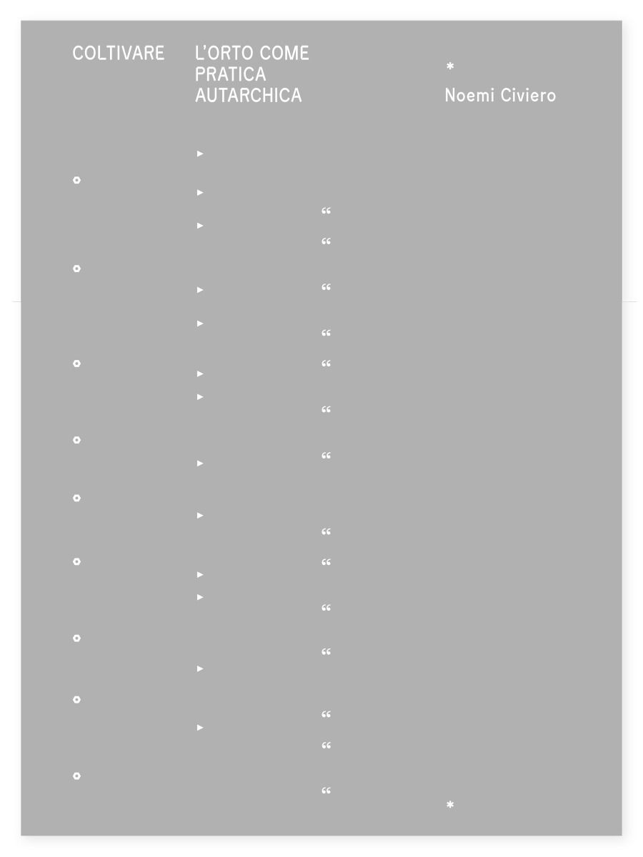 Coltivare. L'orto come pratica autarchica parla di autosufficienza ed è strutturato in forma di manuale pratico per la coltivazione dell’orto.