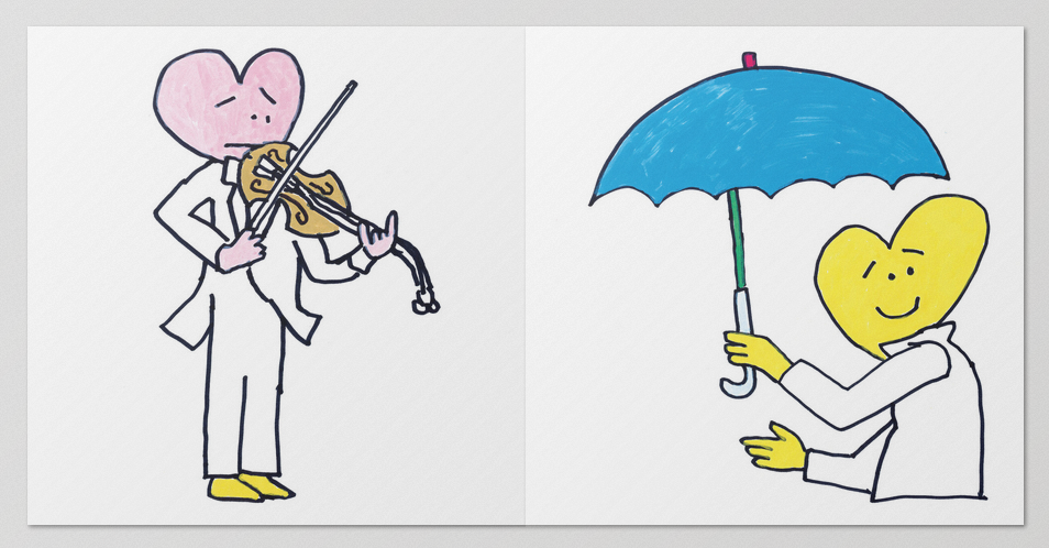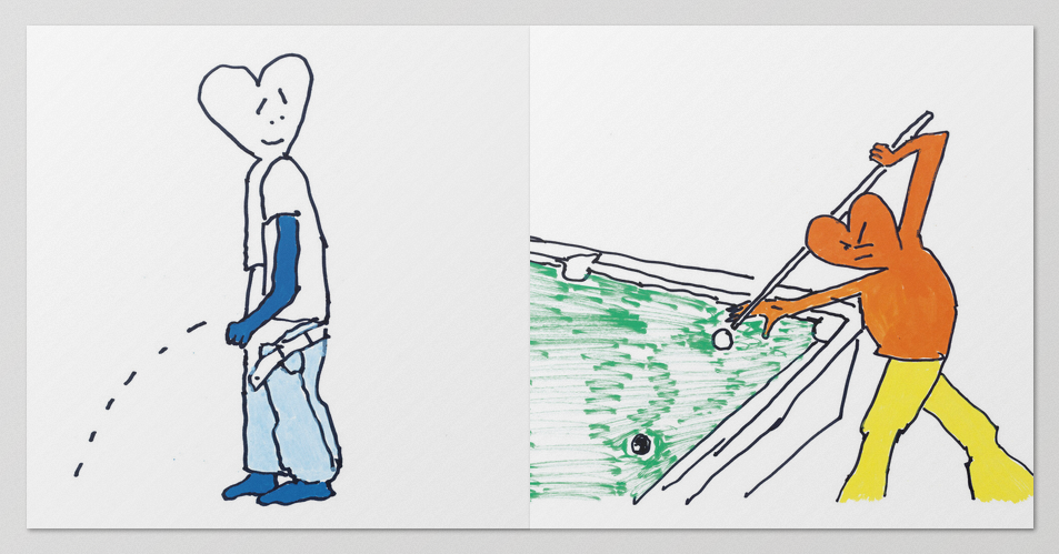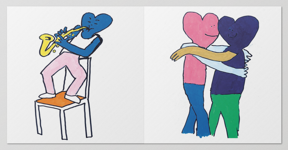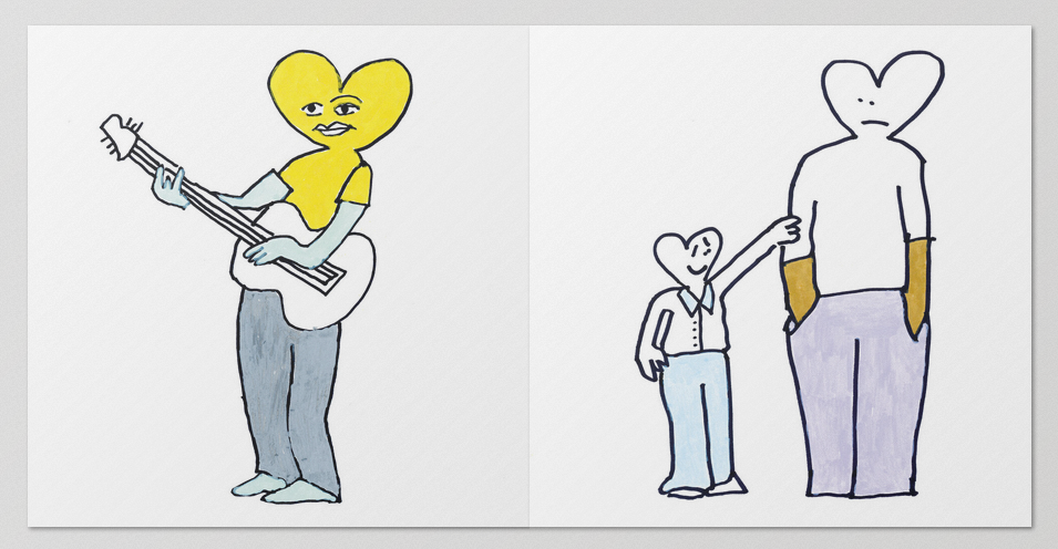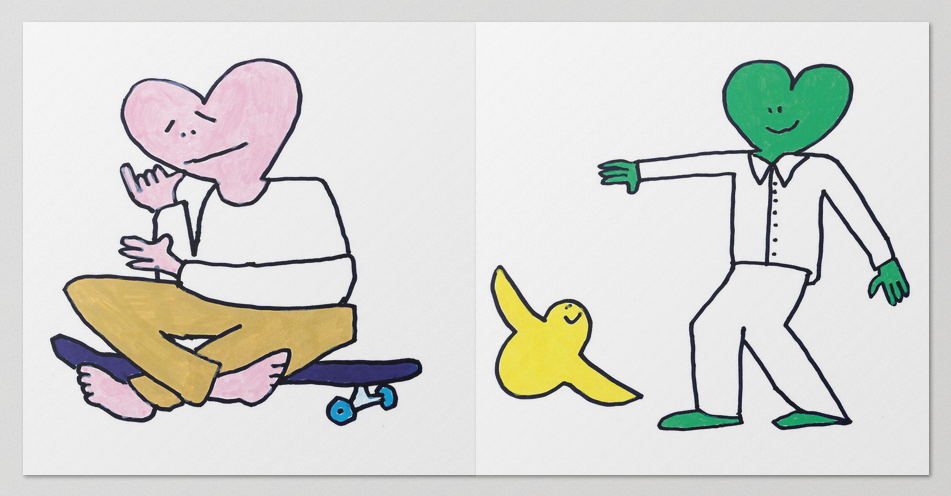 This new series of works features paintings depicting characters with heart-shaped heads in various emotional states and situations, sometimes teetering between the ordinary and the extraordinary. From tender moments of love to unexpected skateboarding scenes, the work is filled with a new iteration of the emotional "schmoo" characters.