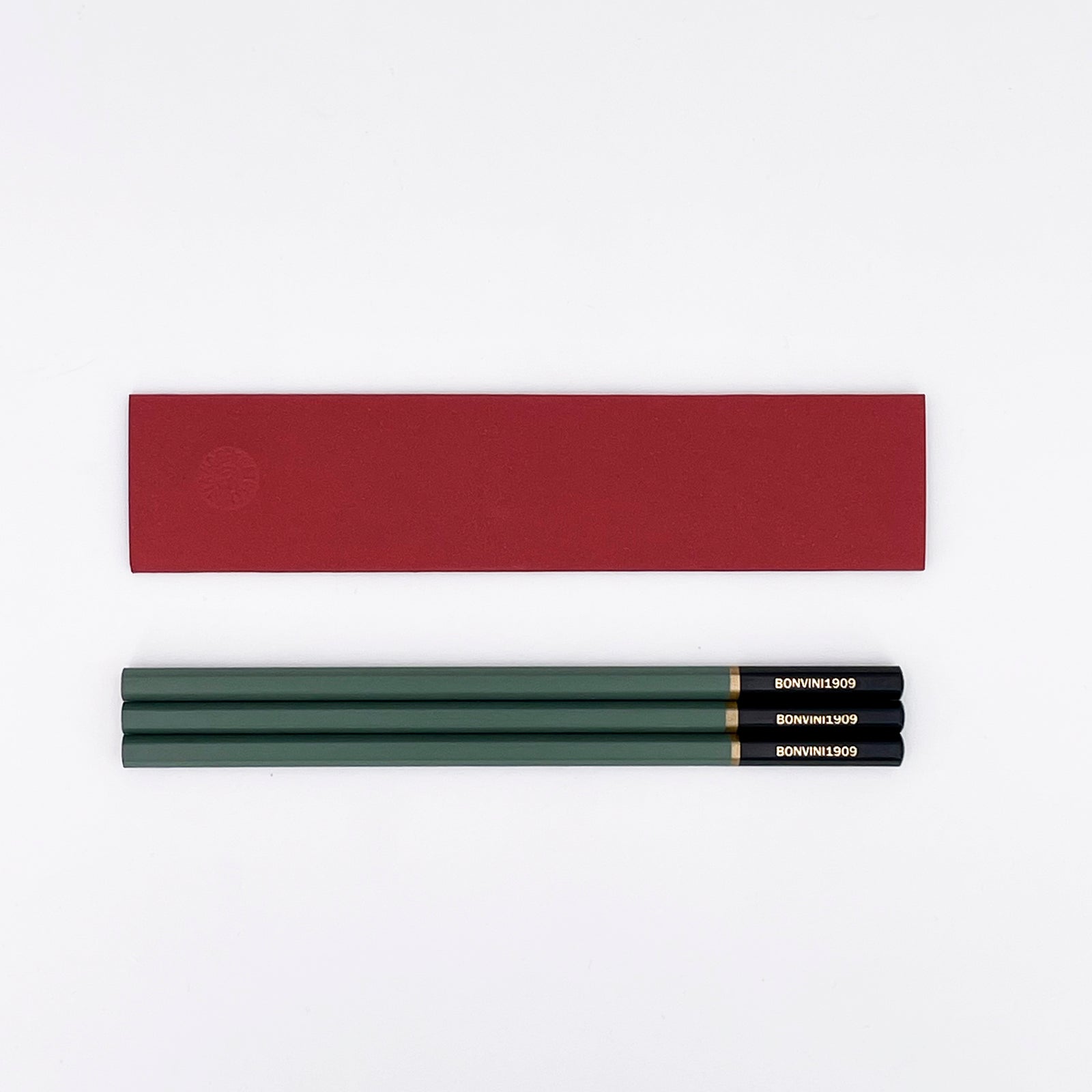 Confezione 3 matite Bonvini1909 realizzate in legno di cedro da antica Fabbrica europea, grafite morbida, con una livrea brillante rosso ciliegia come le carte che ricoprivano le scatole fatte a mano della cartoleria.
