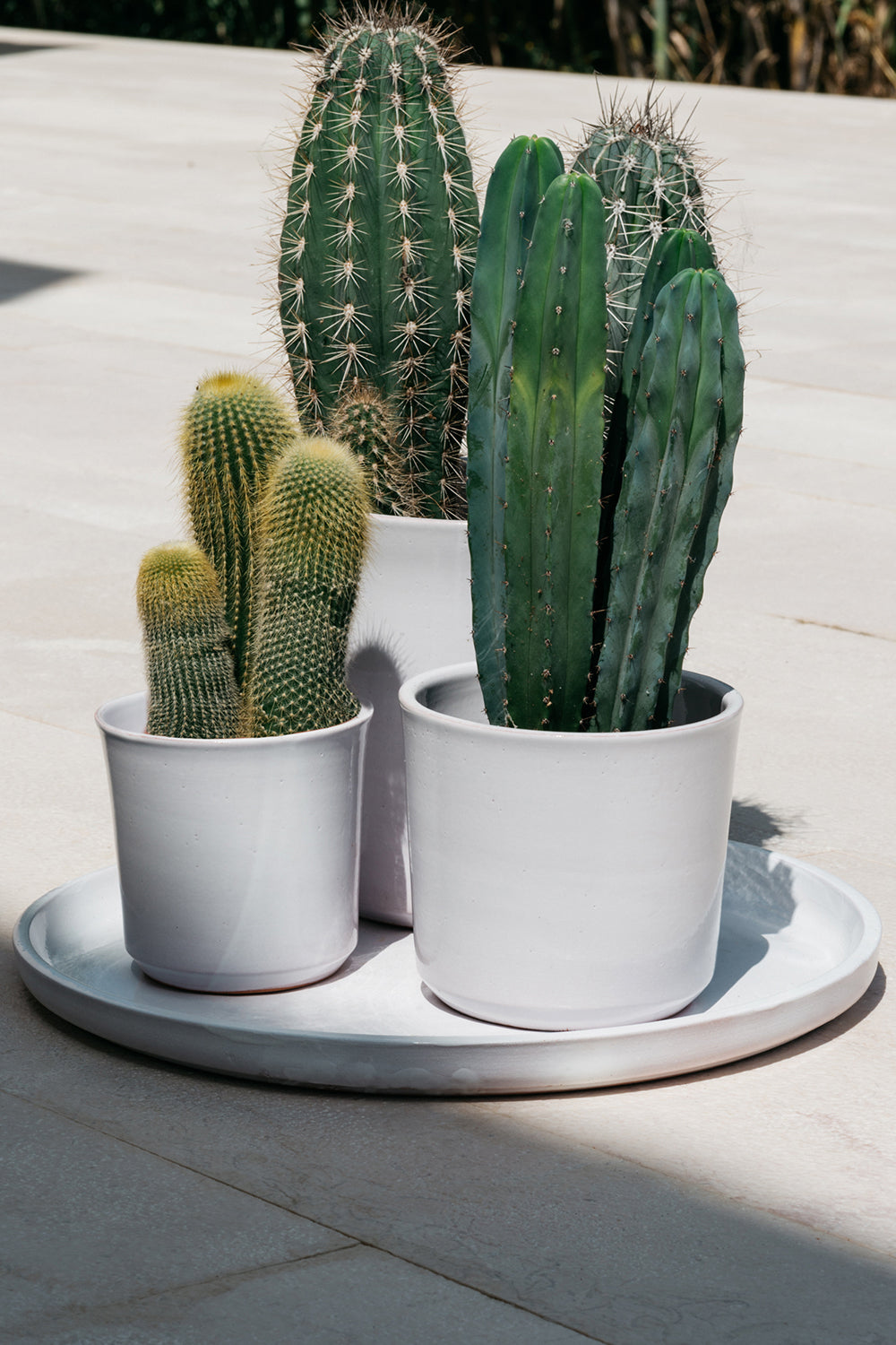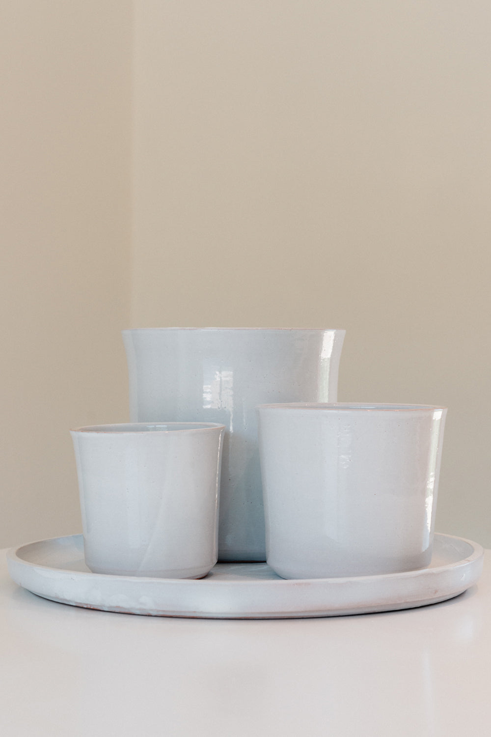 Dimensions: pot I – approx. D 11 x h 13 cm, pot II – approx. D 15 x h 14 cm, pot III – approx. D 18,5 x h 20 cm, saucer – approx. D 42,5 x h 3 cm