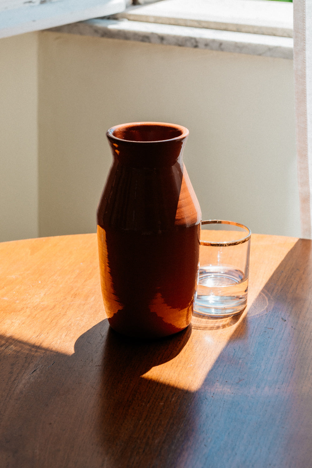 A glazed terracotta jug. It is quite compact, but holds close to 1 litre of water, wine or whatever you want to fill it with. The shape was meant to subtly resemble certain details of existing Mediterranean vessels of both the present and the distant past.