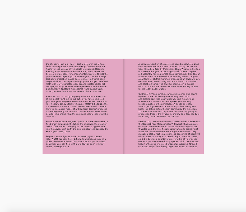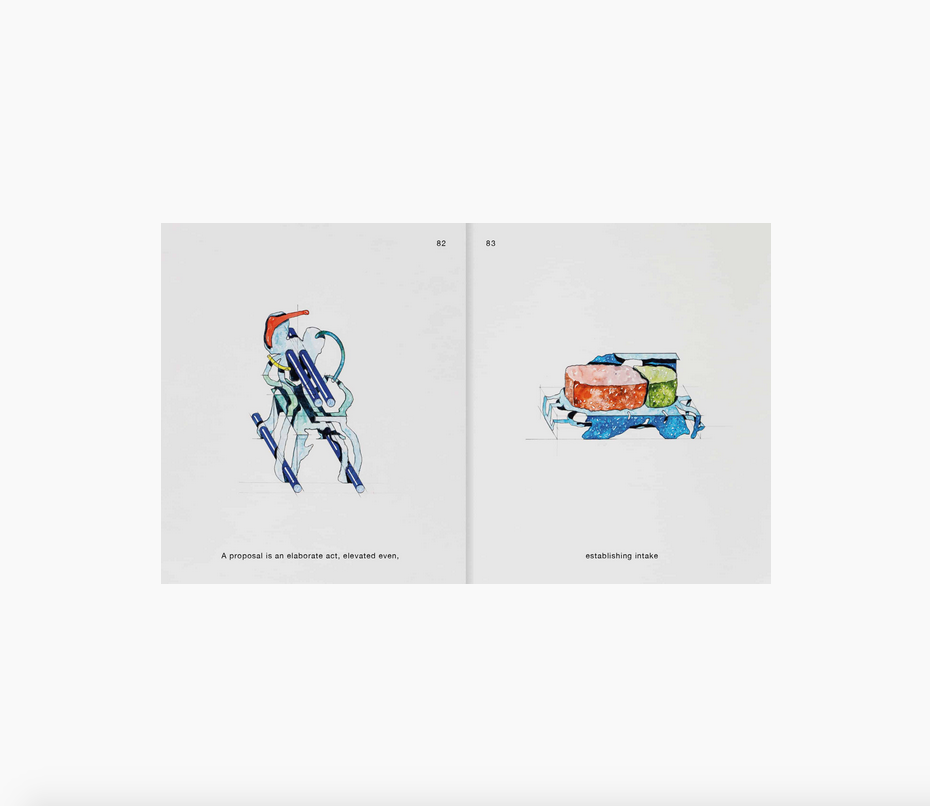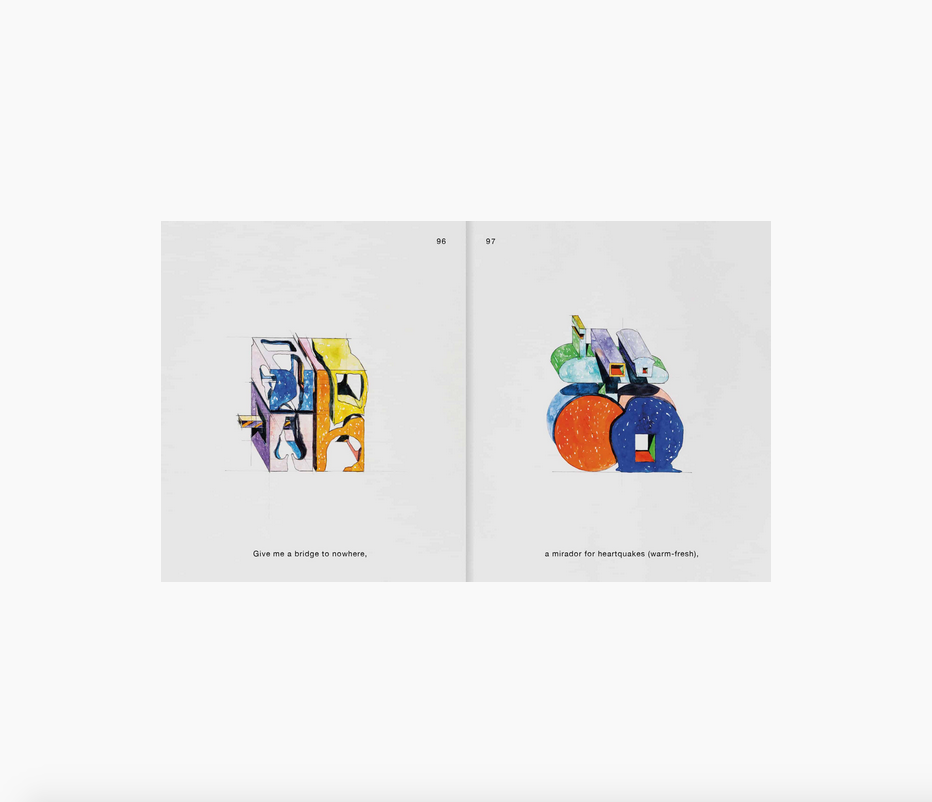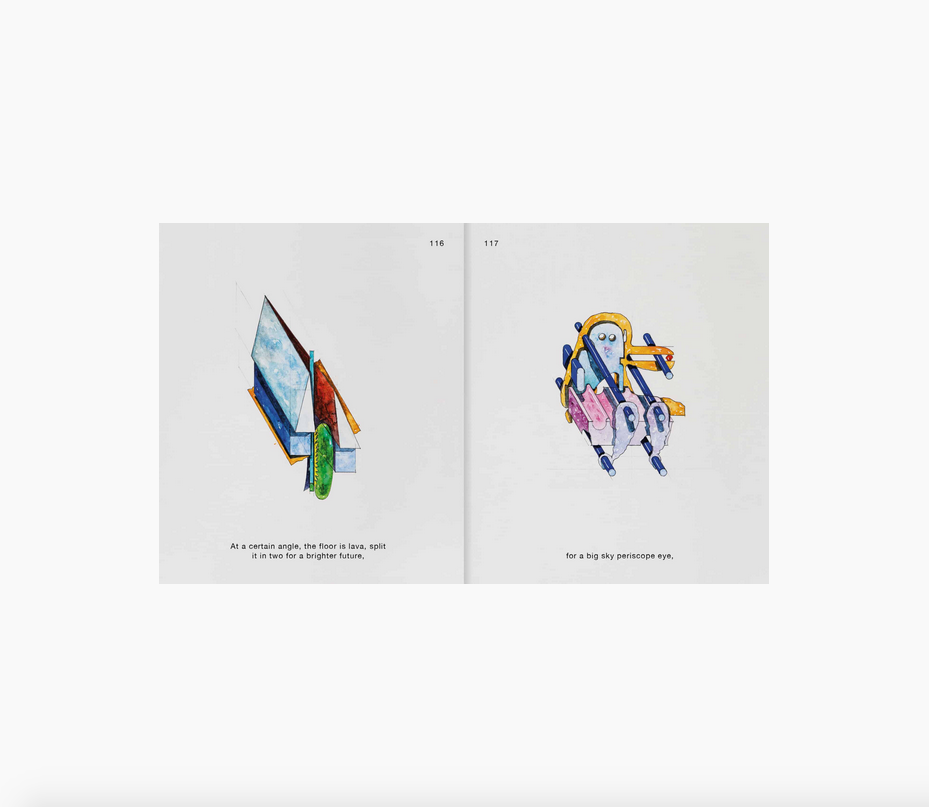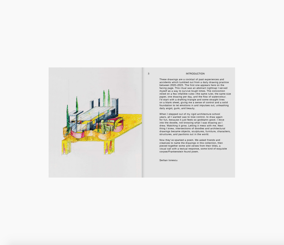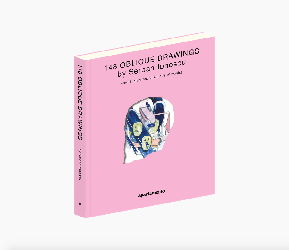 148 Oblique Drawings by Serban Ionescu (and 1 large machine made of words) attirano i lettori nell'album di schizzi di Serban Ionescu dove le vivaci creazioni dell'artista, con il loro spirito giocoso e architettonico, convivono insieme a una poesia realizzata con l'aiuto di amici e familiari degli universi Ionescu-Apartamento. Il libro d’arte raccoglie una serie di immagini realizzate durante la pratica quotidiana del disegno di Serban dal 2020 al 2023, che si basava sullo “stesso righello, sullo stesso formato di carta… e sul flusso dell’acquerello”.