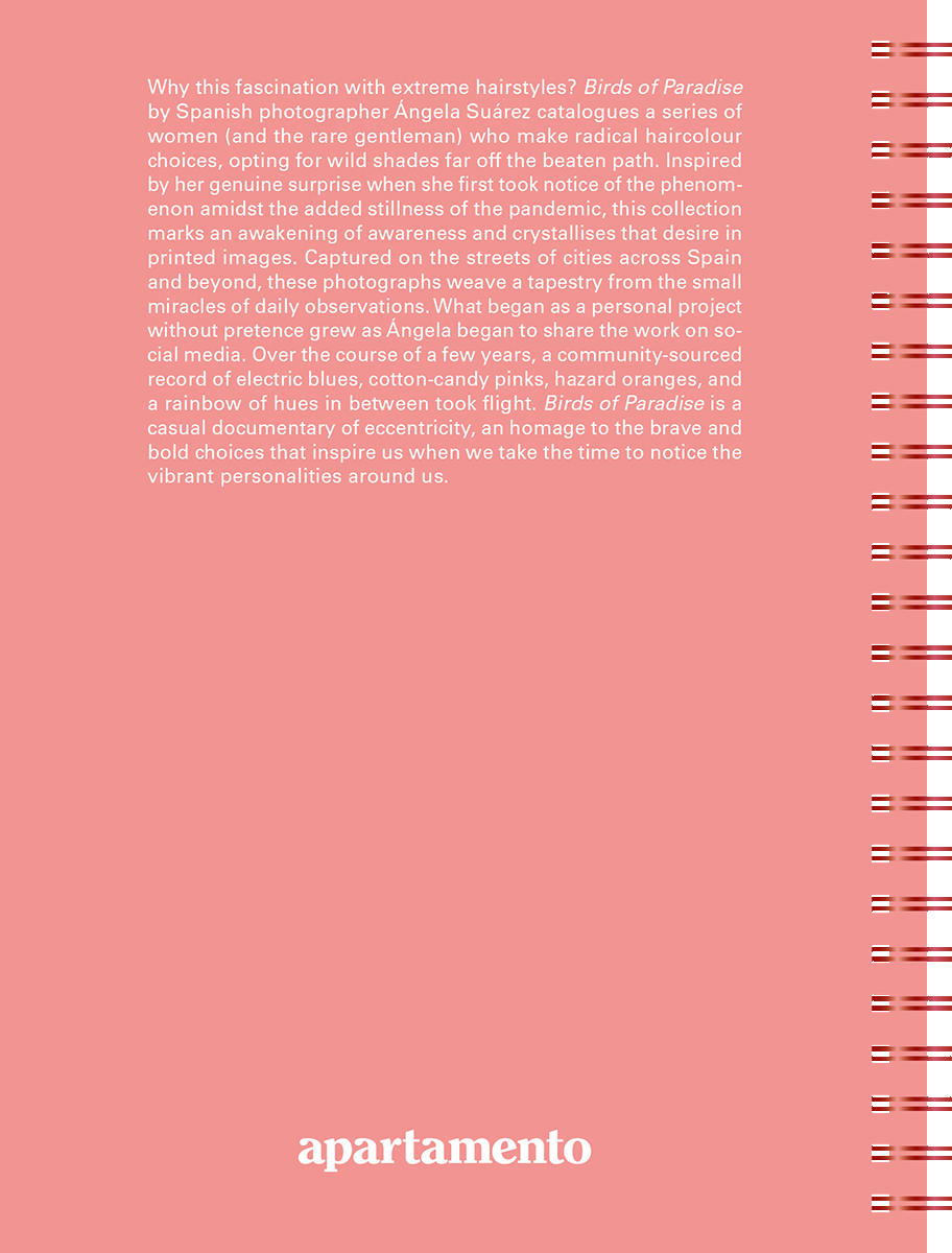 Birds of Paradise è un vivace libro fotografico dell'artista spagnola Ángela Suárez che esplora i colori audaci e vivaci dei capelli incontrati durante le passeggiate nella terra natale della fotografa e oltre. Ispirata dal suo amore per la moda spagnola e la fotografia ritrattistica, uniti alla sua sincera sorpresa quando ha notato per la prima volta questo fenomeno, questa collezione segna un risveglio della consapevolezza e cristallizza l'ossessione di Ángela per le immagini stampate. Quello che era iniziato come un progetto personale di fotografia di strada in Spagna è cresciuto quando Ángela ha iniziato a condividere il suo lavoro sui social media, trasformandosi in una raccolta comunitaria di blu elettrici, rosa zucchero filato, arancioni accesi e un arcobaleno di sfumature intermedie. Birds of Paradise è un documentario informale sull'eccentricità, un omaggio a ciò che può ispirarci quando ci prendiamo il tempo di notare le personalità stravaganti che ci circondano.