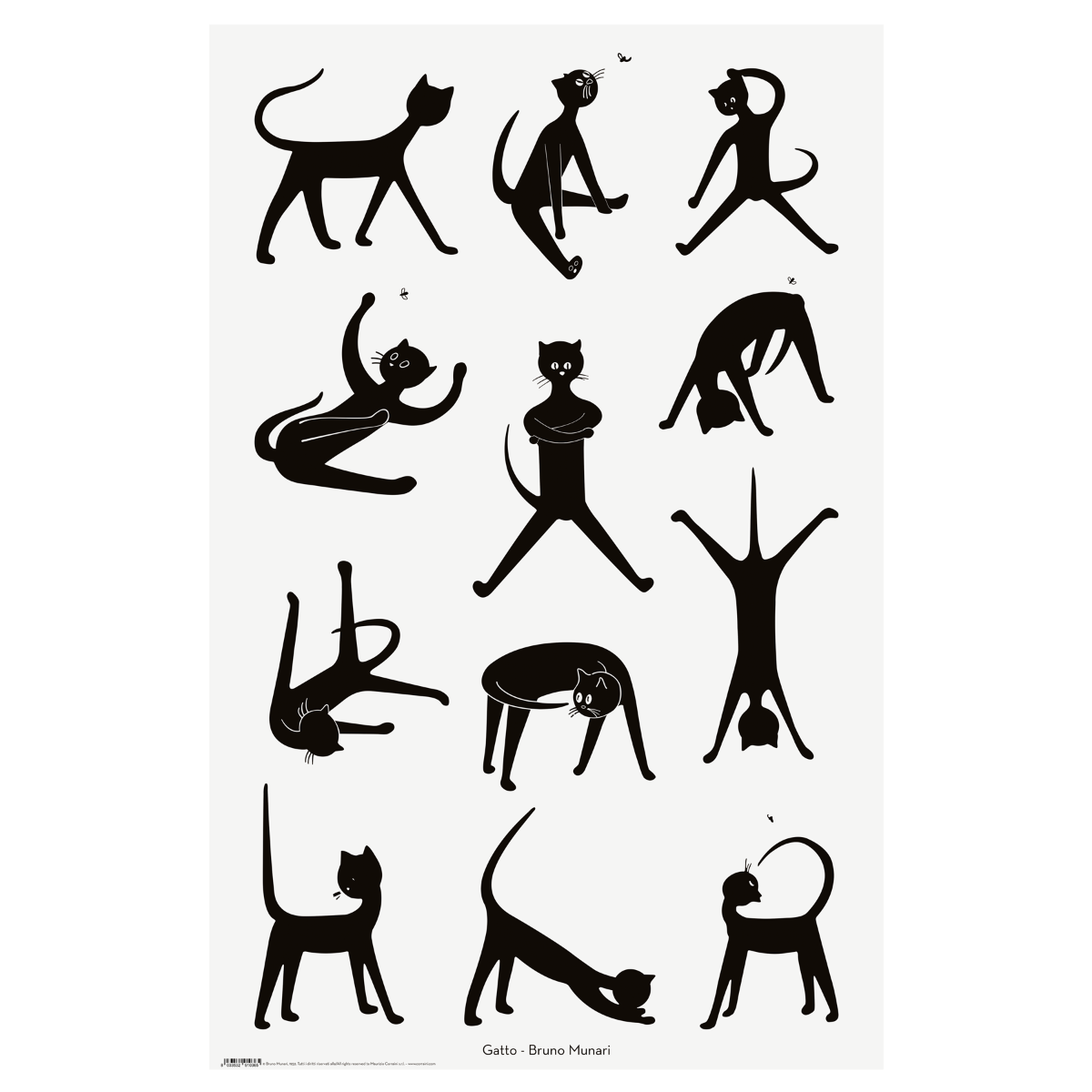 Già presente in molti libri di Munari, il gatto è il protagonista di questo poster, vero e proprio manifesto alla vivacità e all’eleganza dei felini, neri e non. Qui Munari disegna un gatto che non sa, o non vuole, stare fermo: acciambellato o a testa in giù, intento a fare fusa o dispetti, pronto a spiccare un salto (per atterrare sulle zampe) o a lanciarsi in curiose esplorazioni con passo felpato... Una collezione di movimenti buffi e sinuosi, messi nero su bianco con il tratto essenziale di Bruno Munari.