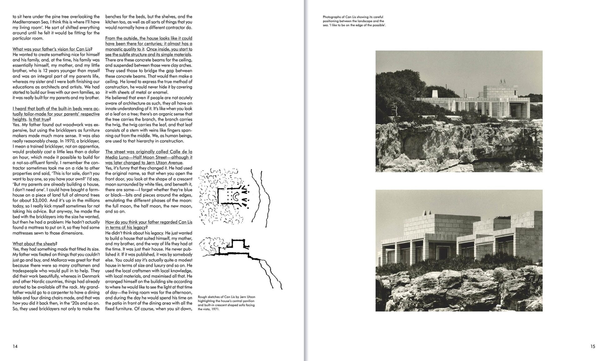 Un saggio fondamentale dello stesso Utzon esplora il suo rapporto con la natura, mentre il figlio dell'architetto, Jan Utzon, ricorda il legame della sua famiglia con Maiorca in una conversazione con il direttore editoriale di Apartamento Robbie Whitehead. Concependo l'orizzonte infinito dell'isola, Line Nørskov Davenport, direttrice delle mostre del Centro Utzon, riflette sulla partenza di Utzon dal Teatro dell'Opera e sul rifugio che alla fine trovò a Maiorca. "È questo il paradiso?", si chiede l'autrice a proposito di uno schizzo iniziale che ha ispirato Can Lis, un sogno che alla fine si è realizzato nei panorami meditativi della casa, agitati solo dalla brezza salata del mare. Can Lis, Jørn Utzon è sponsorizzato da Ferm Living e contiene una prefazione esclusiva di Phillipp Materna, responsabile del marchio e del design.