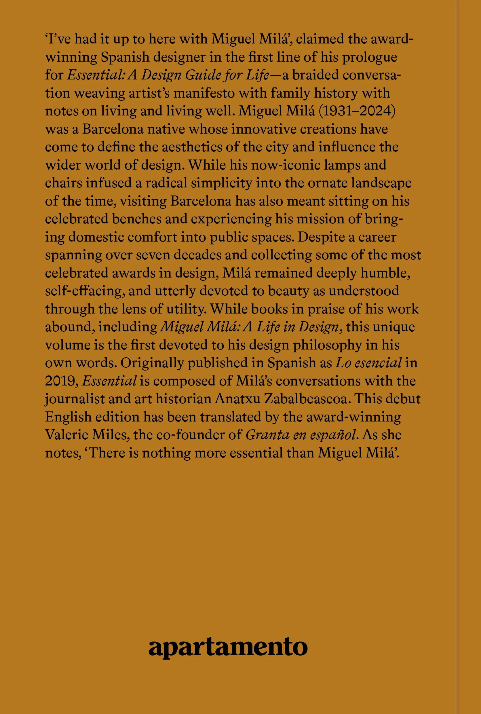 Essential: A Design Guide for Life del celebre designer spagnolo Miguel Milá (1931-2024) è un racconto intrecciato che unisce il manifesto artistico alla storia familiare con appunti sul vivere e sul vivere bene. Pubblicato originariamente in spagnolo con il titolo Lo esencial nel 2019 e tradotto in inglese dalla pluripremiata Valerie Miles, Essential è il primo volume della nuova collana di libri di lettura di Apartamento, incentrata sulle idee e le riflessioni di creativi di fama mondiale. Sebbene esistano numerosi libri che elogiano il suo lavoro, tra cui Miguel Milá: A Life in Design della rivista Apartamento, questo volume unico è il primo dedicato alla sua filosofia di design raccontata con le sue stesse parole.
