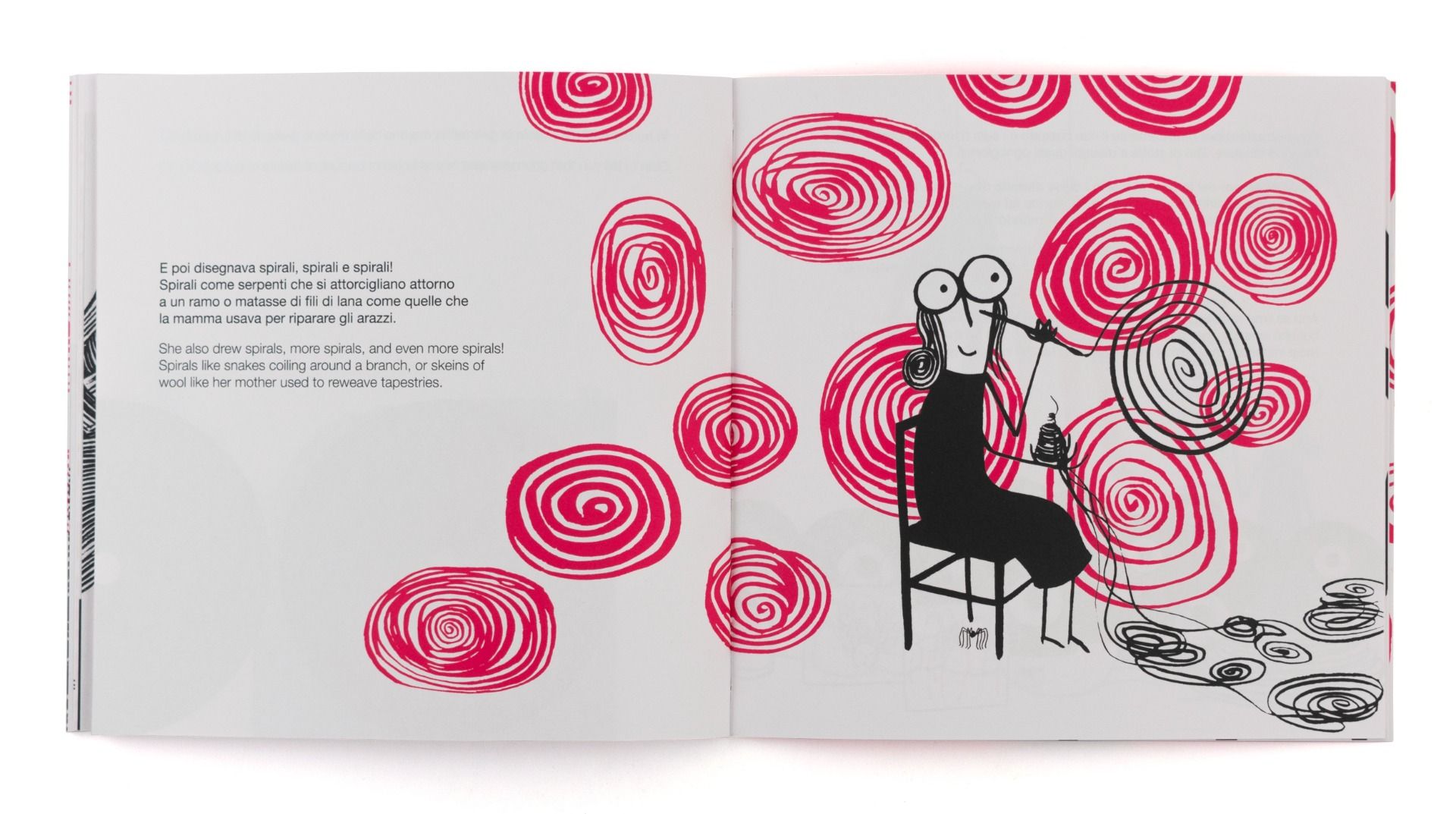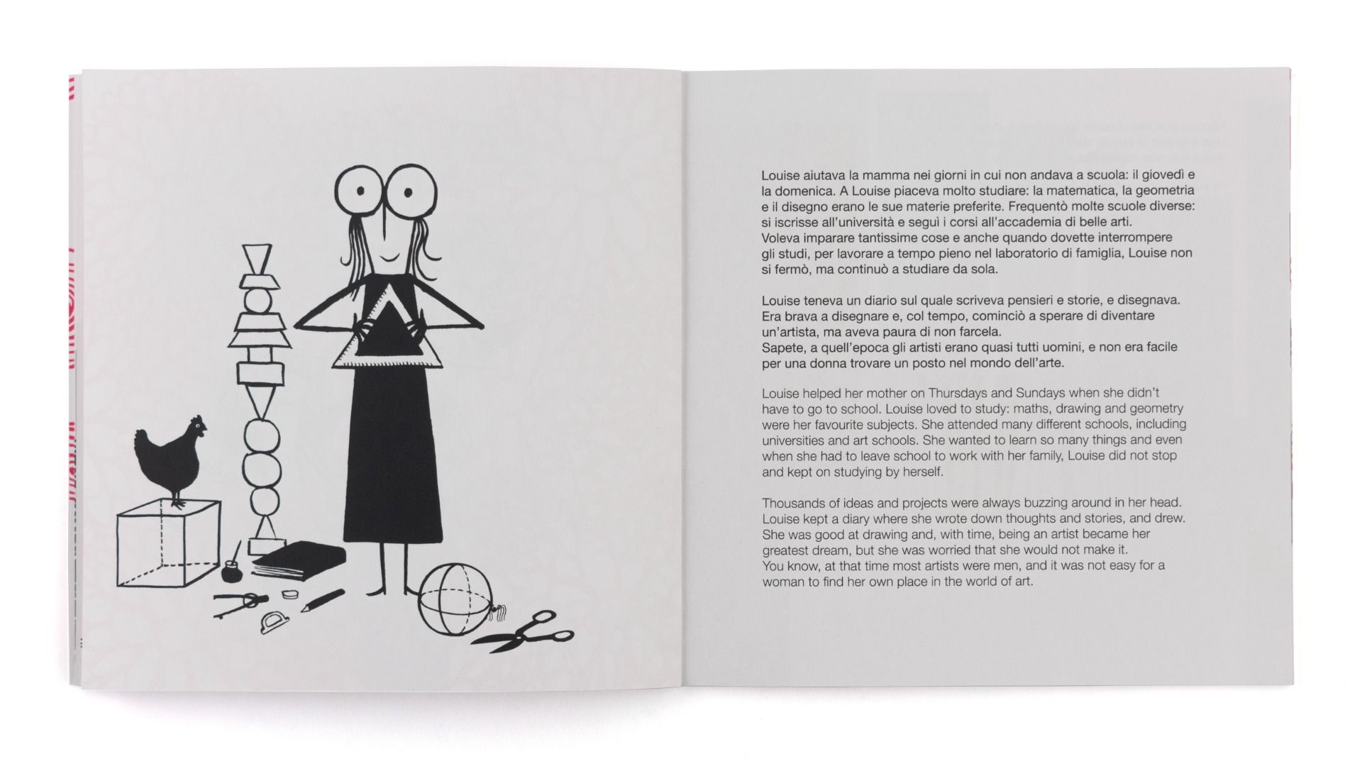 Un desiderio che si realizza a New York, città dove si trasferirà e resterà per tutta la vita: qui Louise diventerà la prima scultrice ad avere una mostra al MoMA. Louise scolpisce esili personaggi che rappresentano i suoi cari rimasti in Francia, riempie interi fogli di parole come ai tempi della scuola, usa oggetti che ha conservato dall’infanzia per creare le sue opere… Costruisce persino un ragno gigante! E se i ragni vi fanno paura, dopo questo libro forse li guarderete con occhi diversi.