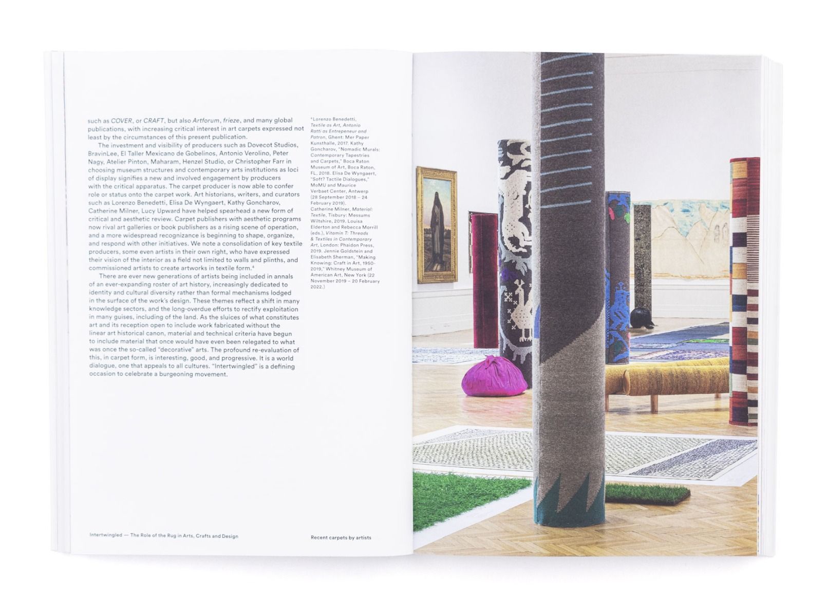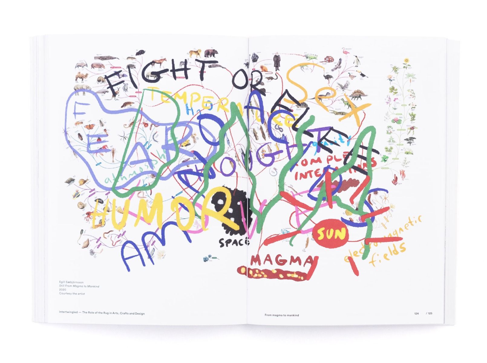 La parola intertwingled, coniata nel 1960 dal sociologo e filosofo statunitense Ted Nelson, esprime la complessità delle interrelazioni del sapere, fatta di miriadi di connessioni e relazioni incrociate. Abbracciando questa visione, Intertwingled. The Role of the Rug in Arts, Crafts and Design – pubblicato in occasione dell’omonima mostra alla Galleria Nazionale di Arte Moderna e Contemporanea di Roma, a cura di Martí Guixé e Inga Knölke – propone una lettura aperta e dirompente del mondo interconnesso in cui viviamo. Intertwingled nasce come progetto originale per esplorare, attraverso le opere e gli oggetti all’interno del dispositivo della mostra e del museo, il tappeto e l’arazzo in campi differenti, dall’arte, all’artigianato, al design; il libro prosegue l’esplorazione iniziata con la mostra, estendendola in direzioni differenti. Il tappeto è proiettato in ambiti più concettuali, stabilendo nuove relazioni che dialogano con idee come il nomadismo, il real estate, le reti visibili e invisibili, i network digitali, l’ipertesto, la decentralizzazione del potere, la narrazione non lineare e il potere insito nel concetto di unione.