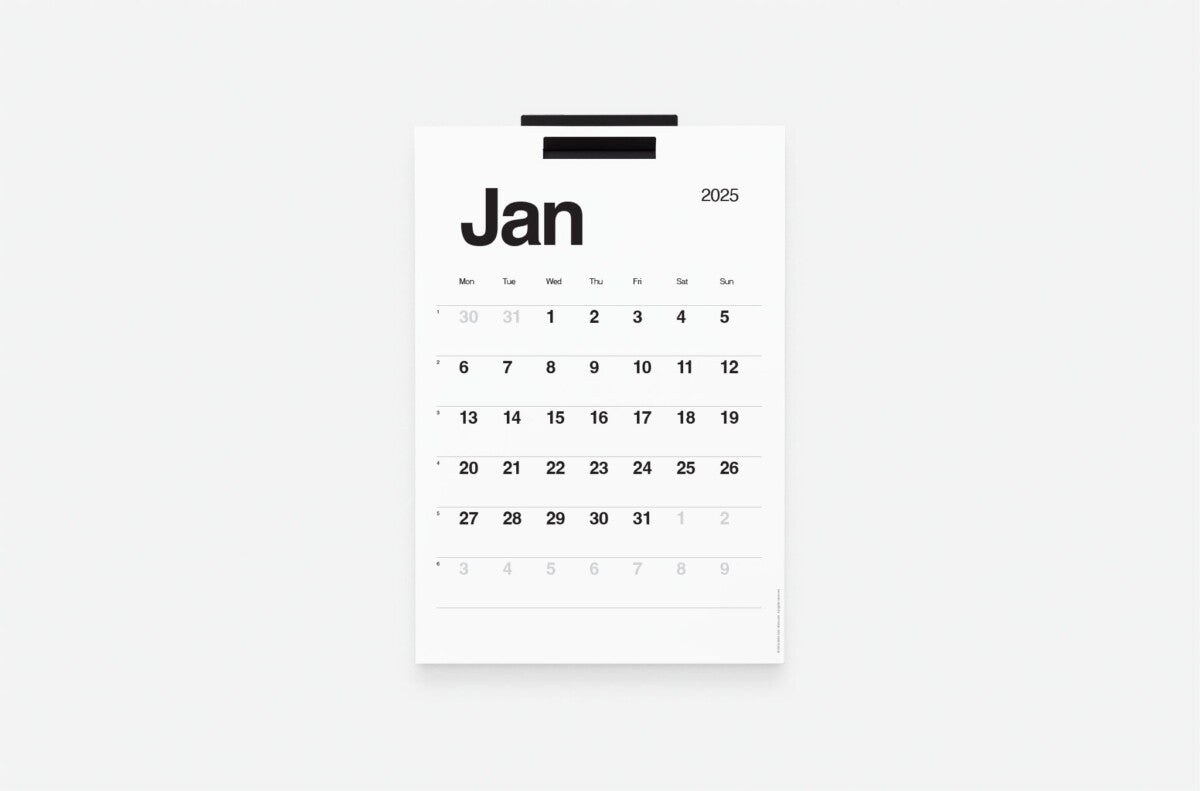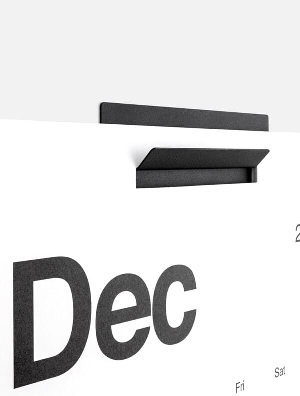 Kal WALL SET 2025 è un calendario da parete composto da una staffa metallica piegata e da sei fogli di carta biadesiva. Per scegliere il tipo di fissaggio, utilizzare il nastro adesivo 3M incluso.