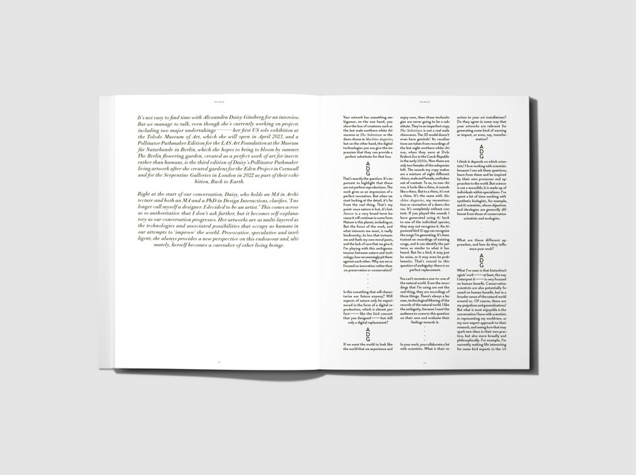 nomad features people who explore the relationship between humans and nature in their work, including artist Zheng Bo, designer duo Formafantasma, Studio Ossidiana, General and Artistic Director at Nieuwe Insituut Aric Chen, furniture manufacturers ecoBirdy, Studio Plastique, designer and architect Michele de Lucchi, artist Alexandra Daisy Ginsberg and many more.