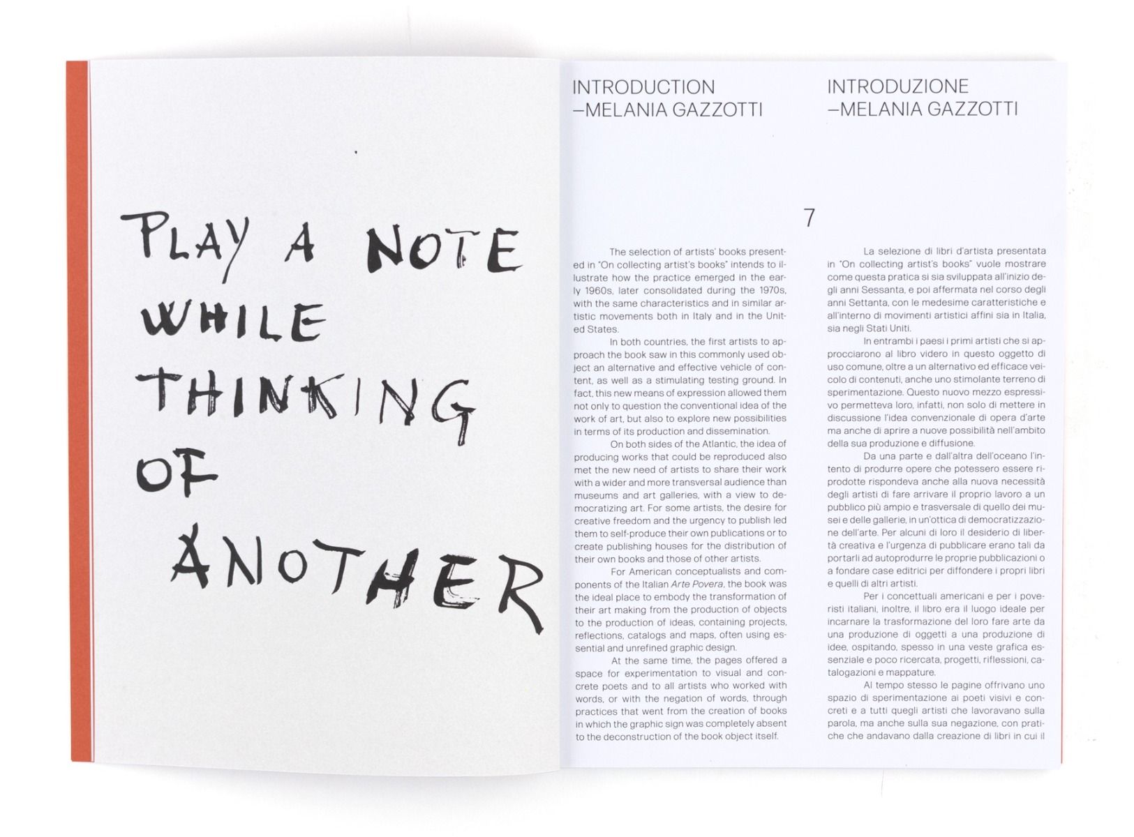 Il volume On collecting artists’ books vuole rendere omaggio a questa importante raccolta, nata dall’esperienza della Dematteis, come studiosa, editore e direttore della Galleria Martano, proponendo un confronto tra gli artisti italiani e quelli americani che, tra gli anni Sessanta e gli anni Settanta, si sono approcciati a questa pratica. In entrambi i paesi infatti movimenti artistici differenti hanno visto in questo oggetto di uso comune, oltre a un alternativo ed efficace veicolo di contenuti, anche uno stimolante terreno di sperimentazione.