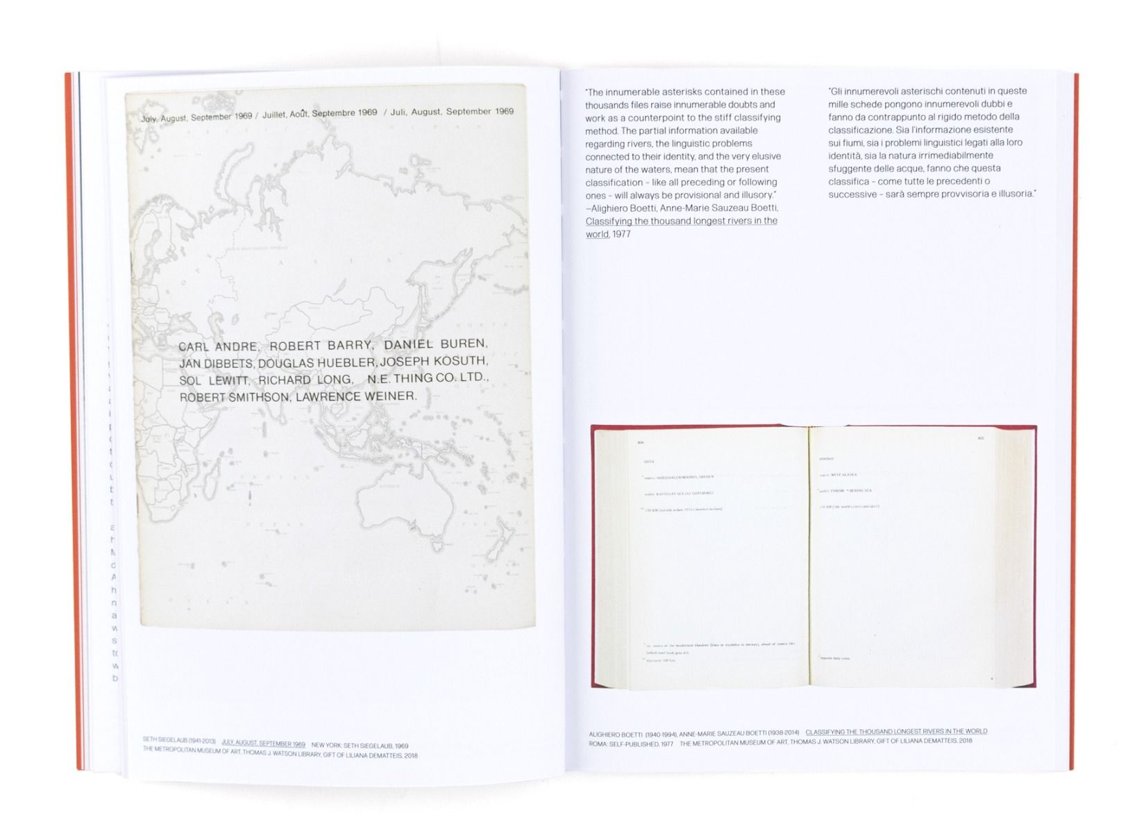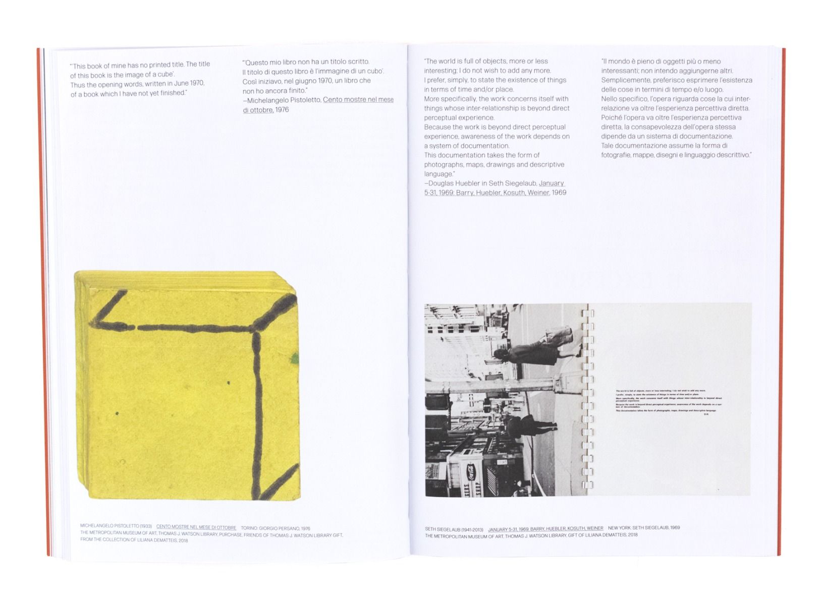Questa selezione di volumi, che mette a confronto alcuni dei libri più emblematici dell’Arte povera, della Minimal art, della Performance art, di Fluxus e della Poesia visiva, è a cura di Melania Gazzotti, ed è introdotta da testi di Liliana Dematteis, Giorgio Di Domenico, Ken Soehner, e Tony White.