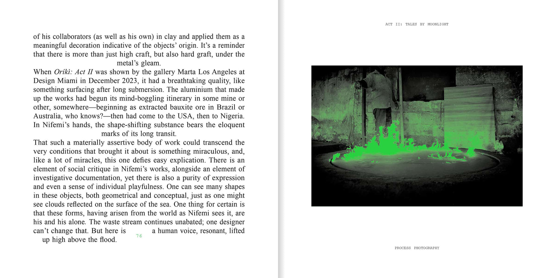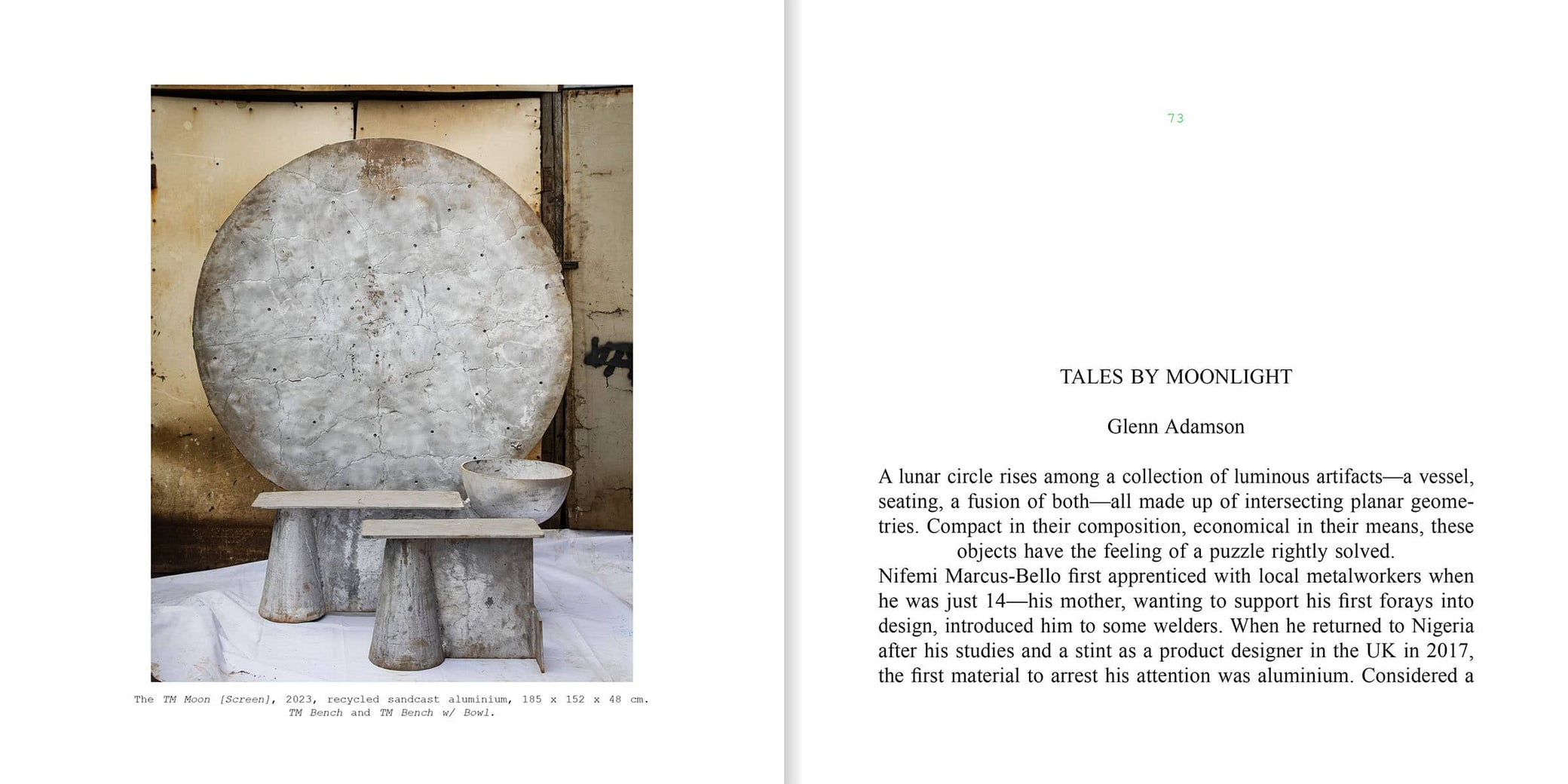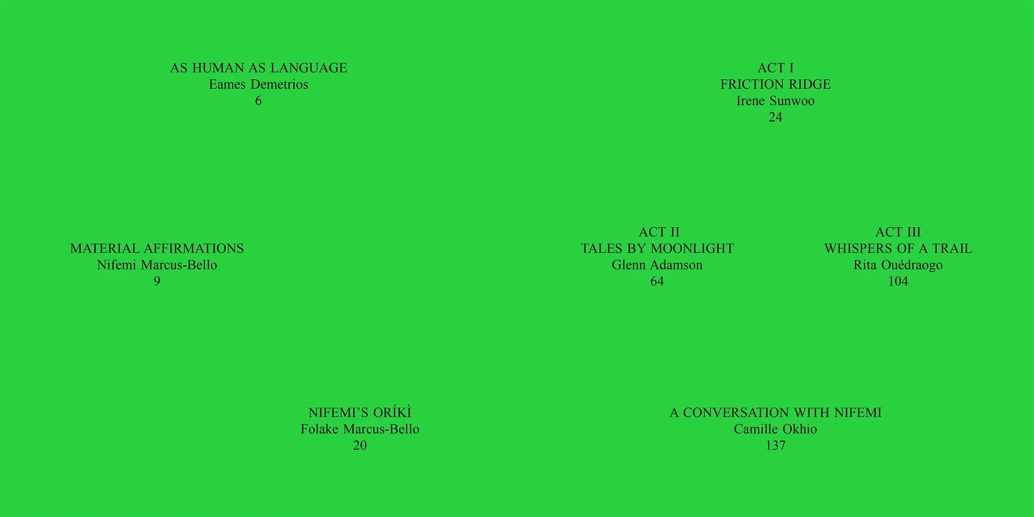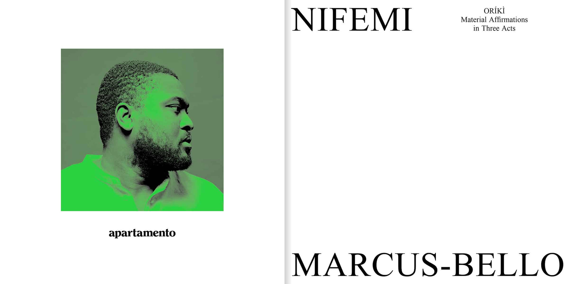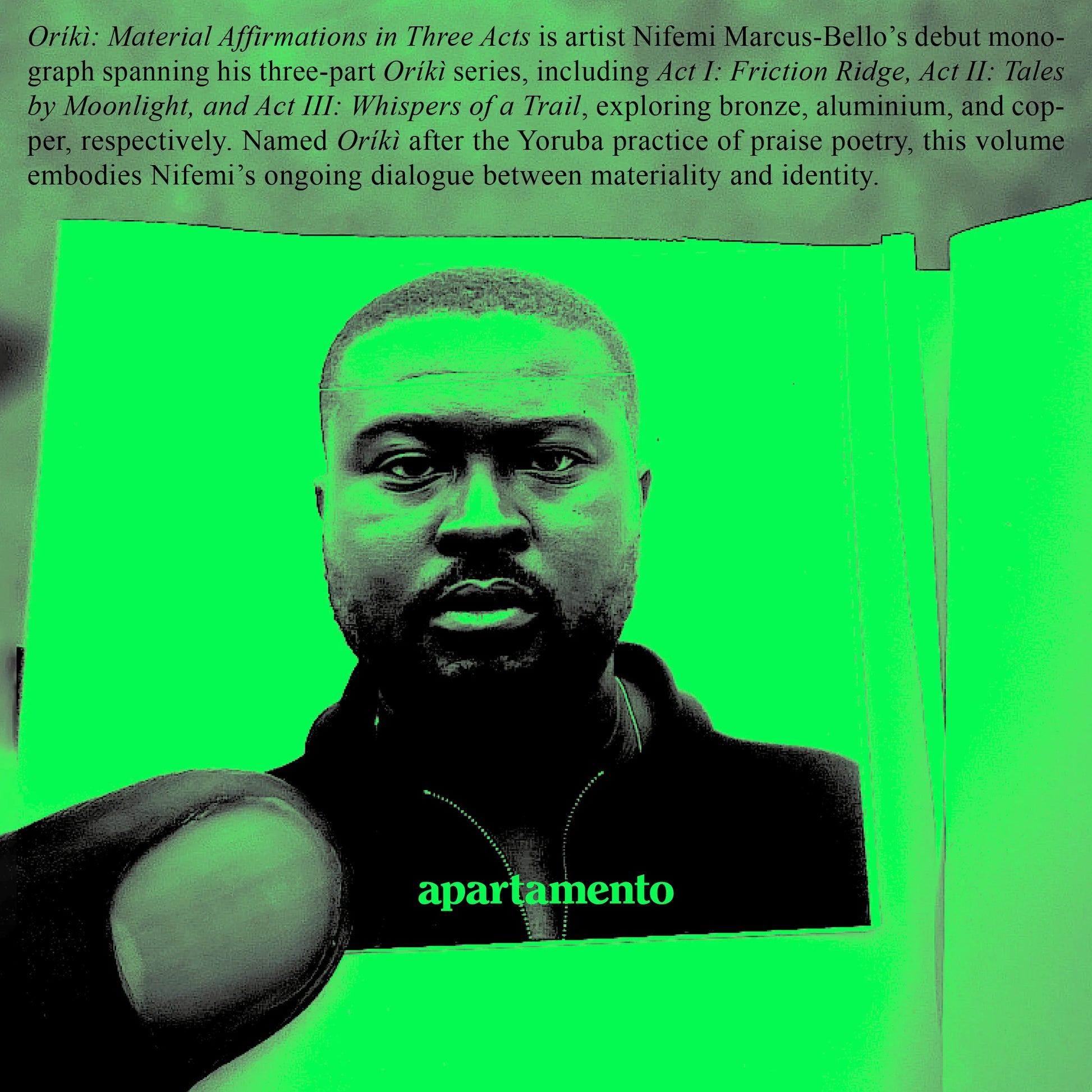 Oríkì: Material Affirmations in Three Acts è la monografia d'esordio dell'artista nigeriano Nifemi Marcus-Bello, che racchiude la sua serie scultorea in tre parti Oríkì, comprendente Act I: Friction Ridge, Act II: Tales by Moonlight e Act III: Whispers of a Trail, che esplora rispettivamente il bronzo, l'alluminio e il rame. Il libro include una prefazione di Eames Demetrios e saggi di Irene Sunwoo, Glenn Adamson e Rita Ouédraogo, oltre a un'intervista esclusiva con Camille Okhio. Intitolato Oríkì in riferimento alla pratica yoruba della poesia di lode, il volume include l'oríkì personale di Nifemi, composto da sua madre, Folake Marcus-Bello, nonché un saggio personale che ripercorre il suo sviluppo artistico dall'infanzia fino al presente. Oríkì: Material Affirmations in Three Acts include sia i ritratti a colori della serie, sia un diario fotografico delle immagini del processo e dell'archivio personale, svelando l'ispirazione e il percorso personale dietro le creazioni premiate di Nifemi, che incarnano il suo continuo dialogo tra materialità e identità. Oríkì: Material Affirmations in Three Acts si aggiunge alla crescente collezione di libri d'arte e design di Apartamento, insieme a Miguel Milá: A Life in Design, Arranging Things di Leonard Koren, Lucia Di Luciano & Giovanni Pizzo: Selected Works, Sam Chermayeff: Beasts e A Thing on a Table in a House di Serban Ionescu.