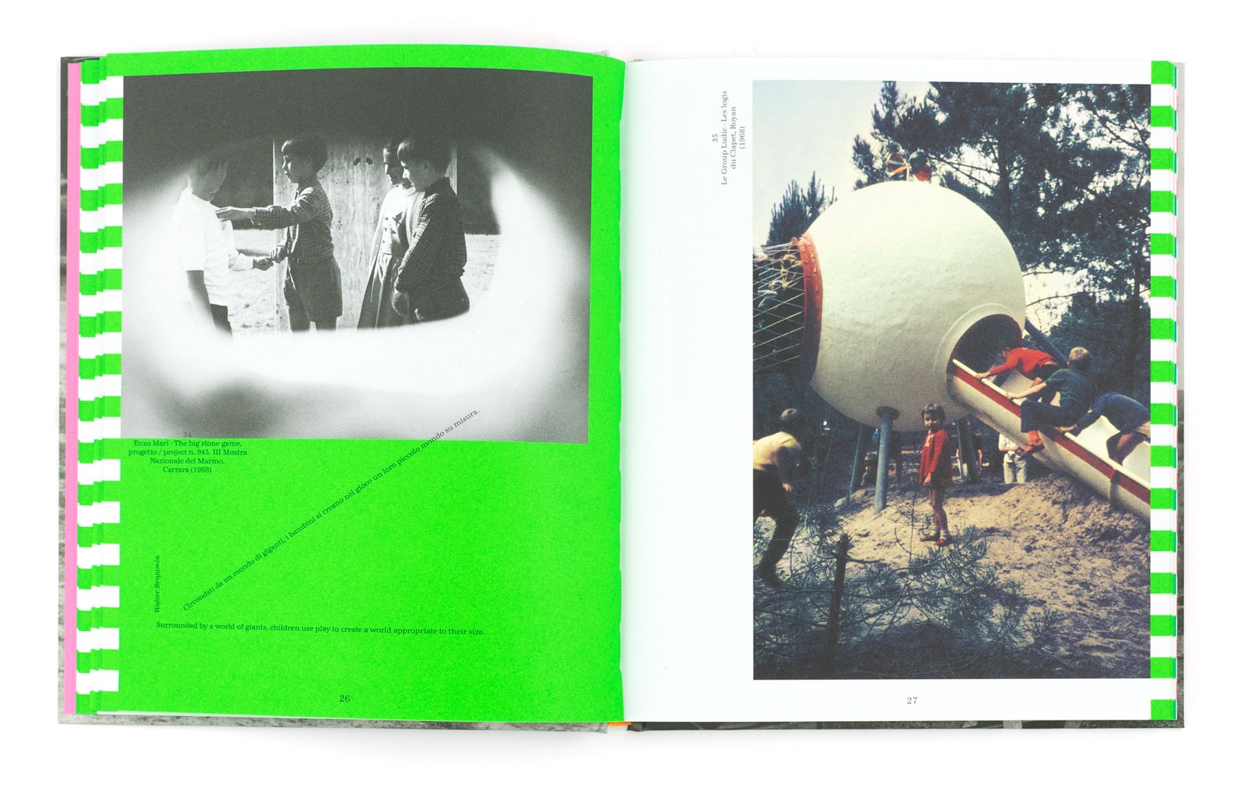 Questo libro, nato da una ricerca della curatrice e storica del design Domitilla Dardi iniziata sul web, si apre con una “storia per immagini” dei playground: una panoramica di progetti di artisti, designer e architetti che nel tempo si sono confrontati con la realizzazione di parchi giochi. A diversi autori è stato poi chiesto di immaginare per questo libro nuovi playground: ecco allora 9 idee proposte da Paul Cox, matali crasset, Konstantin Grcic, Martí Guixé, Lemonot, Gianluca Malgeri e Arina Endo, Studio Ossidiana, Parasite 2.0 e Olimpia Zagnoli, che hanno interpretato in libertà la doppia pagina del libro come un piano di gioco.